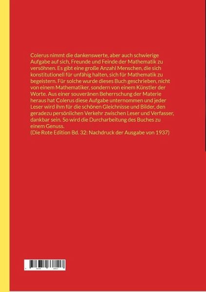 Colerus nimmt die dankenswerte, aber auch schwierige Aufgabe auf sich, Freunde und Feinde der Mathematik zu versöhnen. Es gibt eine große Anzahl Menschen, die sich konstitutionell für unfähig halten, sich für Mathematik zu begeistern. Für solche wurde dieses Buch geschrieben, nicht von einem Mathematiker, sondern von einem Künstler der Worte. Aus einer souveränen Beherrschung der Materie heraus hat Colerus diese Aufgabe unternommen und jeder Leser wird ihm für die schönen Gleichnisse und Bilder, den geradezu persönlichen Verkehr zwischen Leser und Verfasser, dankbar sein. So wird die Durcharbeitung des Buches zu einem Genuss. (Die Rote Edition Bd. 32: Nachdruck der Ausgabe von 1937)