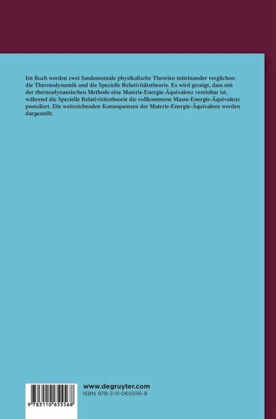 Im Buch werden zwei fundamentale physikalische Theorien miteinander verglichen: die Thermodynamik und die Spezielle Relativitätstheorie. Es wird gezeigt, dass mit der thermodynamischen Methode eine Materie-Energie-Äquivalenz vereinbar ist, während die Spezielle Relativitätstheorie eine Masse-Energie-Äquivalenz postuliert. Die weitreichenden Konsequenzen der Materie-Energie-Äquivalenz werden dargestellt.