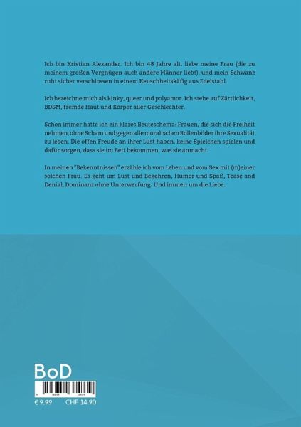 Ich bin Kristian Alexander. Ich bin 48 Jahre alt, liebe meine Frau (die zu meinem großen Vergnügen auch andere Männer liebt), und mein Schwanz ruht sicher verschlossen in einem Keuschheitskäfig aus Edelstahl.Ich bezeichne mich als kinky, queer und polyamor. Ich stehe auf Zärtlichkeit, BDSM, fremde Haut und Körper aller Geschlechter.Schon immer hatte ich ein klares Beuteschema: Frauen, die sich die Freiheit nehmen, ohne Scham und gegen alle moralischen Rollenbilder ihre Sexualität zu leben. Die offen Freude an ihrer Lust haben, keine Spielchen spielen und dafür sorgen, dass sie im Bett bekommen, was sie anmacht.In meinen "Bekenntnissen" erzähle ich vom Leben und vom Sex mit (m)einer solchen Frau. Es geht um Lust und Begehren, Humor und Spaß, Tease and Denial, Dominanz ohne Unterwerfung. Und immer: um die Liebe.