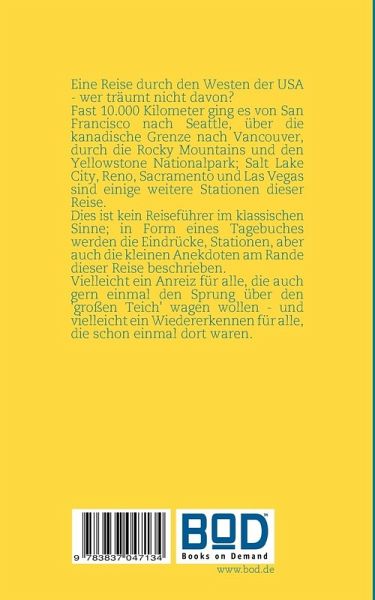Eine Reise durch den Westen der USA - wer träumt nicht davon? Fast 10.000 Kilometer ging es von San Francisco nach Seattle, über die kanadische Grenze nach Vancouver, durch die Rocky Mountains und den Yellowstone Nationalpark; Salt Lake City, Reno, Sacramento und Las Vegas sind einige weitere Stationen dieser Reise.Dies ist kein Reiseführer im klassischen Sinne; in Form eines Tagebuches werden die Eindrücke, Stationen, aber auch die kleinen Anekdoten am Rande dieser Reise beschrieben.Vielleicht ein Anreiz für alle, die auch gern einmal den Sprung über den 'großen Teich' wagen wollen - und vielleicht ein Wiedererkennen für alle, die schon einmal dort waren.