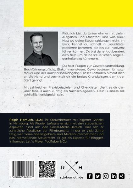 Plötzlich bist du Unternehmer mit vielen Aufgaben und Pflichten! Und was nun? Hast du deine Steuerzahlungen nicht im Blick, kannst du schnell in Liquiditätsprobleme kommen, die bis zur Insolvenz führen können. Du bist daher gut beraten, dich früh um deine steuerlichen Angelegenheiten zu kümmern. Du hast Fragen zur Gewerbeanmeldung, Buchführungspflicht, Einkommensteuer, Gewerbesteuer, Umsatzsteuer und der Künstlersozialabgabe? Dieser Leitfaden nimmt dich an die Hand und vermittelt dir ein breites Grundwissen, damit der Start gelingt. Mit zahlreichen Praxisbeispielen und Checklisten dient es dir darüber hinaus auch künftig als Nachschlagewerk. Dein Business soll schließlich erfolgreich sein.