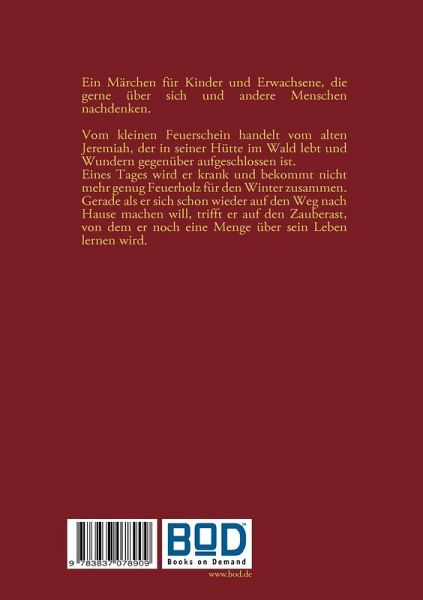 Ein Märchen für Kinder und Erwachsene, die gerne über sich und andere Menschen nachdenken.Vom kleinen Feuerschein handelt vom alten Jeremiah, der in seiner Hütte im Wald lebt und Wundern gegenüber aufgeschlossen ist. Eines Tages wird er krank und bekommt nicht mehr genug Feuerholz für den Winter zusammen. Gerade als er sich schon wieder auf den Weg nach Hause machen will, trifft er auf den Zauberast, von dem er noch eine Menge über sein Leben lernen wird.