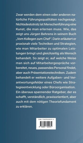 Zwar werden dem einen oder anderen natürliche Führungsqualitäten nachgesagt. Nichtsdestotrotz ist Menschenführung eine Kunst, die man erlernen muss. Wie, das zeigt uns Jürgen Behrens in seinem Buch "Vom Kollegen zum Chef". Darin erläutert er praxisnah viele Techniken und Strategien, wie man Mitarbeiter zu optimalen Leistungen bringt und gleichzeitig als Mensch behandelt. So zeigt er, auf welche Weise man sich auf Mitarbeitergespräche vorbereitet, neues, passendes Personal findet, aber auch Präsentationstechniken. Zudem behandelt er weitere Aufgaben- und Verantwortungsfelder eines Chefs wie Strategieentwicklung oder Büroorganisation.Ein überaus spannender Ratgeber, der es schafft, verständlich, praxisorientiert, aber auch mit dem nötigen Theoriefundament zu erklären.