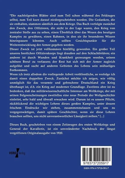 Wenn ich trotz alledem die vorliegende Arbeit veröffentliche, so verfolge ich damit einen doppelten Zweck. Zunächst möchte ich zeigen, wie völlig unmöglich für das verarmte und gebrochene Deutschland ein Krieg überhaupt ist, d.h. ein Krieg auf moderner Grundlage. Zweitens aber ist zu bedenken, daß das militärwissenschaftliche Interesse am Weltkriege, der mit seinen Folgeerscheinungen zweifellos eine neue Periode der Weltgeschichte einleitet, sehr bald und überall erwachen wird. Darum ist es unsere Pflicht, rückblickend die wichtigen Lehren dieses großen Kampfes, unter dessen frischem Eindrucke wir stehen, zusammenzufassen und uns zu vergegenwärtigen, damit spätere Geschlechter, wenn sie diese Lehren brauchen sollten, uns nicht unverantwortlicher Lässigkeit zeihen." [...]