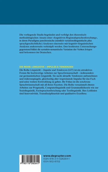 Die vorliegende Studie begründet und verfolgt den theoretisch-methodologischen Ansatz einer "kognitiven Regionalsprachenforschung", in deren Paradigma panchronische (nämlich variationslinguistische plus sprachgeschichtliche) empirische Analysen einerseits mit kognitiv-linguistischen Analysen andererseits verknüpft werden. Den konkreten Untersuchungsgegenstand bildet die syntaktisch-semantische Variation der Verben kriegen und bekommen, die aus kognitiv-semantischer, variationslinguistischer und sprachgeschichtlicher Perspektive analysiert werden. Als Forschungslabor dienen die regionalsprachlichen Varietäten des zusammenhängenden deutschsprachigen Raums, die in ihrer areal-horizontalen wie auch sozial-vertikalen Variationsdimension von den Basisdialekten bis zu standardsprachlichen Registern Berücksichtigung finden.