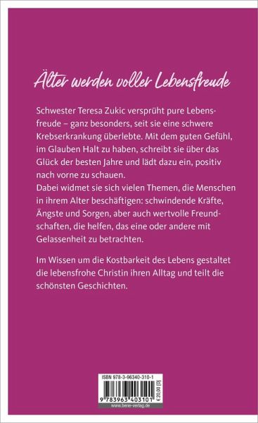 Schwester Teresa Zukic widmet sich vielen Themen, die Menschen in ihrem Alter beschäftigen: schwindende Kräfte, damit verbundene Ängste und Sorgen, aber auch wertvolle Freundschaften und Beziehungen, die helfen, das eine oder andere mit Gelassenheit zu betrachten. Sie ist sich sicher, dass es auch an unserer Einstellung zum Leben liegt, ob wir - trotz allem - glücklich sind. Und ja, es ist eine Kunst, bewusst und fröhlich in den Tag zu starten und das Leben mit beiden Händen zu ergreifen. Weiterhin neugierig zu bleiben, auf alles, was es zu entdecken gibt und was uns geschenkt wird. Im Wissen um die Kostbarkeit des Lebens und dem guten Gefühl, im Glauben Halt zu haben, gestaltet die ansteckend lebensfrohe Frau ihren Alltag und teilt die schönsten Geschichten.