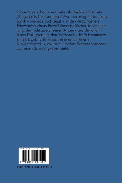 Zwar unterlag Subventionspolitik in den vergangenen Jahrzehnten einem Prozeß finanzpolitischer Rationalisierung,der nicht zuletzt seine Dynamik aus der öffentlichen Diskussion um den Wildwuchs der Subventionen erhielt. Ergebnis ist jedoch eine entpolitisierte Subventionspolitik,die beim Problem Subventionsabbau vor neuen Schwierigkeiten steht.