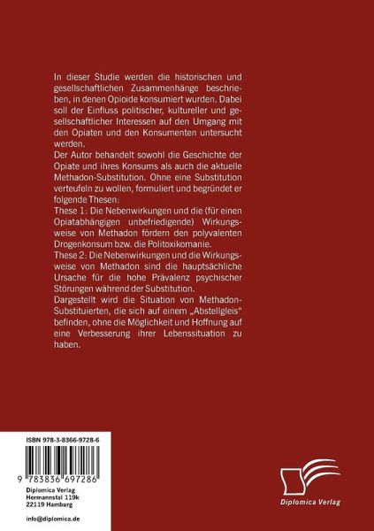Der Inhalt dieses Fachbuchs lässt sich in zwei Teile unterteilen. Der erste Teil behandelt die Geschichte der Opiate mit Hinblick auf die jeweiligen gesellschaftlichen Kontroversen um den Konsum. Im zweiten Teil hat sich der Autor für die aktuelle Methadon-Substitution interessiert. Ohne eine Substitution verteufeln zu wollen, formulierte und begründete er folgende Thesen: