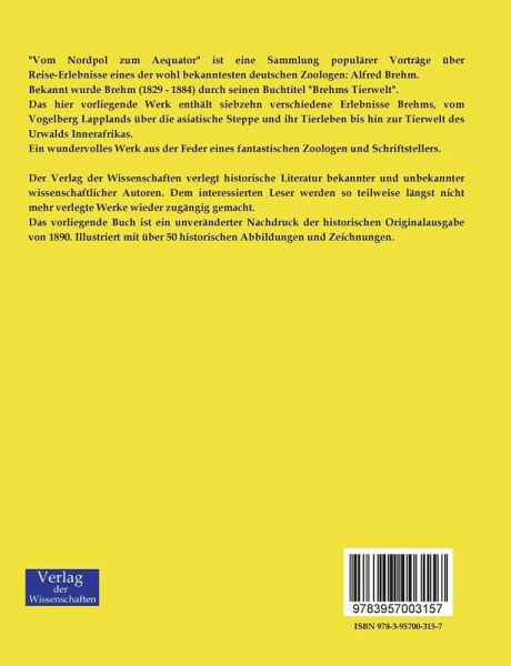 "Vom Nordpol zum Aequator" ist eine Sammlung populärer Vorträge über Reise-Erlebnisse eines der wohl bekanntesten deutschen Zoologen: Alfred Brehm.