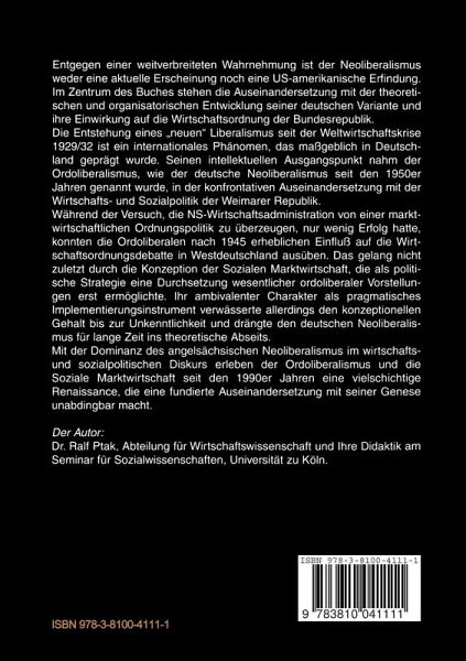 Im Zentrum des Buches stehen deshalb die Auseinandersetzung mit der theoretischen und organisatorischen Entwicklung des deutschen Neoliberalismus, der seit den 1950er Jahren unter dem Begriff Ordoliberalismus firmiert und seine Einwirkung auf die Wirtschaftsordnung der Bundesrepublik durch die Konzeption der Sozialen Marktwirtschaft.