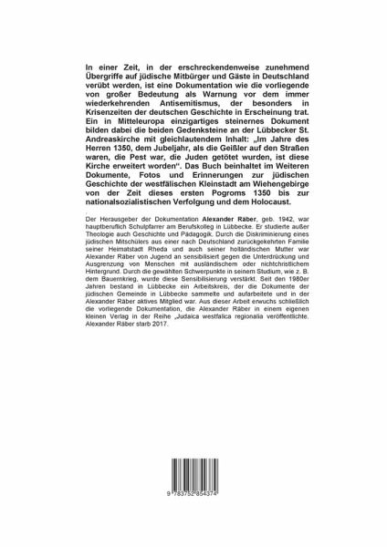 In einer Zeit, in der erschreckendenweise zunehmend Übergriffe auf jüdische Mitbürger und Gäste in Deutschland verübt werden, ist eine Dokumentation wie die vorliegende von großer Bedeutung als Warnung vor dem immer wiederkehrenden Antisemitismus, der besonders in Krisenzeiten der deutschen Geschichte in Erscheinung trat. Ein in Mitteleuropa einzigartiges steinernes Dokument bilden dabei die beiden Gedenksteine an der Lübbecker St. Andreaskirche mit gleichlautendem Inhalt: Im Jahre des Herren 1350, dem Jubeljahr, als die Geißler auf den Straßen waren, die Pest war, die Juden getötet wurden, ist diese Kirche erweitert worden. Das Buch beinhaltet im Weiteren Dokumente, Fotos und Erinnerungen zur jüdischen Geschichte der westfälischen Kleinstadt am Wiehengebirge von der Zeit dieses ersten Pogroms 1350 bis zur nationalsozialistischen Verfolgung und dem Holocaust. Es stützt sich dabei vor allem auf zwei Forschungsarbeiten über das jüdische Leben im ehemaligen Landkreis Lübbecke, und zwar die Dissertation von Volker Beckmann: Die jüdische Bevölkerung des Landkreises Lübbecke und Halle i. W. vom Vormärz bis zur Befreiung vom Faschismus 1815-1945 sowie das Werk von Bernd-Wilhelm Linnemeier: Jüdisches Leben im Alten Reich. Stadt und Fürstentum Minden in der Frühen Neuzeit, Studien zur Regionalgeschichte. Seit der Ausstellung Vom Peststein zum Holocaust, die im Herbst 2002 in der Volksbank Lübbecke stattfand, gab es immer wieder Nachfragen nach Dokumenten zur Geschichte des mit dem Holocaust ausgelöschten jüdischen Lebens in Lübbecke und Umgebung. So konnte 2015 die 5., erweiterte Auflage des Buches erscheinen, erweitert wurde sie vor allem durch farbige Reproduktionen der Bilder des jüdischen Künstlers Max Lazarus, der u. a. die Lübbecker Synagoge 1928 ausgestaltet hatte.