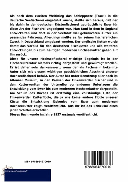 Diese für unsere Hochseefischerei wichtige Begebnis ist in der Fischereiliteratur niemals richtig dargestellt und gewürdigt worden. Es ist daher sehr dankenswert, wenn der als Fachmann bekannte Autor sich mit diesem wichtigen geschichtlichen Abschnitt unserer Hochseefischerei befaßt. Der Autor hat unter Benutzung aller noch im Altonaer Museum, in den Kreisen der Finkenwerder Fischer und in den Kutterwerften der Unterelbe vorhandenen Unterlagen die Entwicklung vom Ewer bis zum modernen Hochseekutter dargestellt. Am Schluß des Buches ist erstmalig eine vollständige Liste der Finkenwerder Kutterflotte, die ja wie keine andere Flotte unserer Küste die Entwicklung lückenlos vom Ewer zum modernen Hochseekutter zeigt, veröffentlicht. Aus ihr ist das Schicksal eines jeden Schiffes ersichtlich.