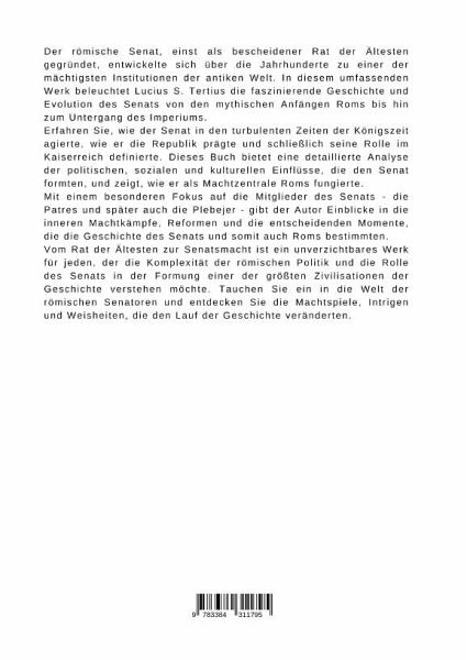 Der römische Senat, einst als bescheidener Rat der Ältesten gegründet, entwickelte sich über die Jahrhunderte zu einer der mächtigsten Institutionen der antiken Welt. In diesem umfassenden Werk beleuchtet Lucius S. Tertius die faszinierende Geschichte und Evolution des Senats von den mythischen Anfängen Roms bis hin zum Untergang des Imperiums.Erfahren Sie, wie der Senat in den turbulenten Zeiten der Königszeit agierte, wie er die Republik prägte und schließlich seine Rolle im Kaiserreich definierte. Dieses Buch bietet eine detaillierte Analyse der politischen, sozialen und kulturellen Einflüsse, die den Senat formten, und zeigt, wie er als Machtzentrale Roms fungierte.Mit einem besonderen Fokus auf die Mitglieder des Senats - die Patres und später auch die Plebejer - gibt der Autor Einblicke in die inneren Machtkämpfe, Reformen und die entscheidenden Momente, die die Geschichte des Senats und somit auch Roms bestimmten.Vom Rat der Ältesten zur Senatsmacht ist ein unverzichtbaresWerk für jeden, der die Komplexität der römischen Politik und die Rolle des Senats in der Formung einer der größten Zivilisationen der Geschichte verstehen möchte. Tauchen Sie ein in die Welt der römischen Senatoren und entdecken Sie die Machtspiele, Intrigen und Weisheiten, die den Lauf der Geschichte veränderten.