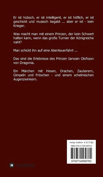 Prinz Iarwain Olofsson hat ein Problem. Er ist der Nachfahre einer Dynastie von heroischen Kriegern und Kriegerinnen, doch er ist völlig ungeeignet zum martialischen Handwerk. Und zu allem Übel naht das Turnier der Königreiche, das in diesem Jahr am Hofe des Dragonischen Reiches, Iarwains Heimat, stattfinden wird. Was tut man mit einem Prinzen, der kein Schwert halten kann?Man sendet ihn auf eine Reise, die ihn möglichst weit vom Ort der Prügelei hinweg bringen möge. Gemeinsam mit seinem Freund, dem Hofnarren Jester, zieht der friedfertige Thronfolger umher - incognito, versteht sich. Dies sind die Abenteuer des Prinzen Iarwain Olofsson von Dragonia ... Ein Märchen für jugendliche und jung gebliebene Leser, mit einem guten Schuss augenzwinkernden Humors.