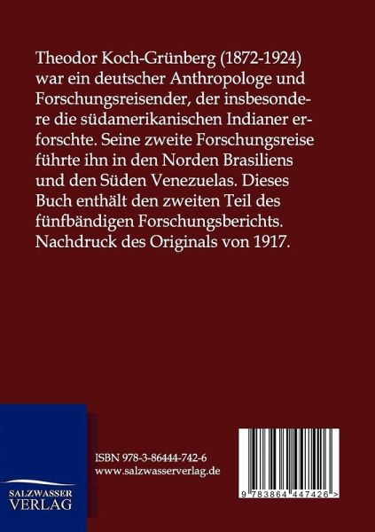 Theodor Koch-Grünberg (1872-1924) war ein deutscher Anthropologe und Forschungsreisender, der insbesondere die südamerikanischen Indianer erforschte. Seine zweite Forschungsreise führte ihn in den Norden Brasiliens und den Süden Venezuelas. Dieses Buch enthält den zweiten Teil des fünfbändigen Forschungsberichts. Nachdruck des Originals von 1917.