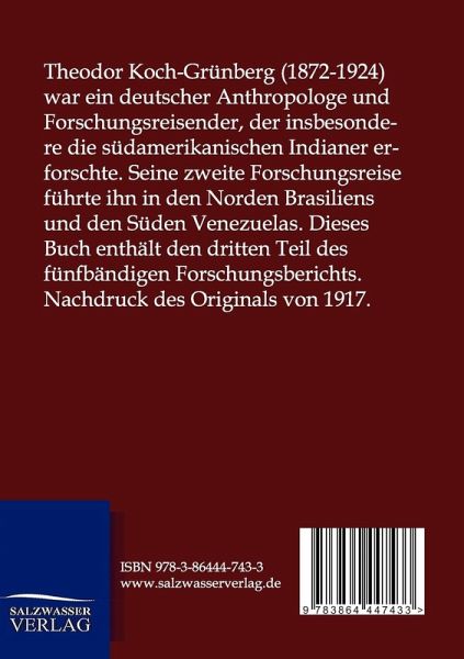 Theodor Koch-Grünberg (1872-1924) war ein deutscher Anthropologe und Forschungsreisender, der insbesondere die südamerikanischen Indianer erforschte. Seine zweite Forschungsreise führte ihn in den Norden Brasiliens und den Süden Venezuelas. Dieses Buch enthält den dritten Teil des fünfbändigen Forschungsberichts. Nachdruck des Originals von 1917.