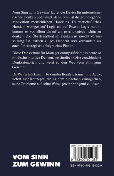 I: Über sinn-orientiertes Denken.- 1. Über den grundlegenden Unterschied von Sinn und Zweck.- 2. Wahrnehmen - Bewerten - Entscheiden.- 3. Über das konstruktive Denken.- 4. Über das produktive Denken.- 5. Über das intuitive Denken.- 6. Über das paradoxe Denken.- 7. Zusammenfassung: Sinn-orientiertes Denken.- II Über Sinn-Orientierung in der Unternehmens-Leitung.- 1. Über den Unterschied zwischen Führen und Leiten.- 2. Sinn und Zweck in der Unternehmens-Leitung.- 3. Über das strategische Denken.- 4. Über das taktische Denken.- III Über Sinn-Orientierung in der Mitarbeiter-Führung.- 1. Sinn- und Zweck in der Mitarbeiter-Führung.- 2. Führen als Motivieren: Das 'Von-den-anderen-her-Denken 'bei der Lösung personaler Probleme.- 3. Führen als individuelle Maßarbeit.- 4. Das Sinn-Konzept der Geführten als Denk-Ansatz der Führung.- IV Über Sinn und Gewinn im unternehmerischen und individuellen Denken.- 1. Gewinn ist sinn-orientiert.- 2. Das Unternehmen und seine Gewinne.- 3. Der einzelne und seine Gewinne.- Zusammenfassung: Sinn-orientiertes Denken - Systematik des Denkens.- Anmerkungen.- Stichwortverzeichnis.