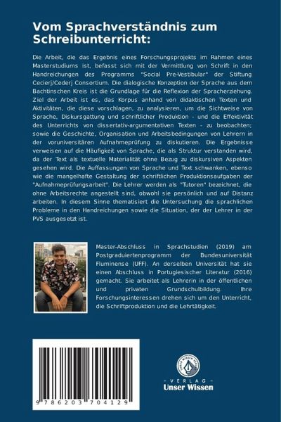 Die Arbeit, die das Ergebnis eines Forschungsprojekts im Rahmen eines Masterstudiums ist, befasst sich mit der Vermittlung von Schrift in den Handreichungen des Programms "Social Pre-Vestibular" der Stiftung Cecierj/Cederj Consortium. Die dialogische Konzeption der Sprache aus dem Bachtinschen Kreis ist die Grundlage für die Reflexion der Spracherziehung. Ziel der Arbeit ist es, das Korpus anhand von didaktischen Texten und Aktivitäten, die diese vorschlagen, zu analysieren, um die Sichtweise von Sprache, Diskursgattung und schriftlicher Produktion - und die Effektivität des Unterrichts von dissertativ-argumentativen Texten - zu beobachten; sowie die Geschichte, Organisation und Arbeitsbedingungen von Lehrern in der voruniversitären Aufnahmeprüfung zu diskutieren. Die Ergebnisse verweisen auf die Häufigkeit von Sprache, die als Struktur verstanden wird, da der Text als textuelle Materialität ohne Bezug zu diskursiven Aspekten gesehen wird. Die Auffassungen von Sprache und Text schwanken, ebenso wie die mangelhafte Gestaltung der schriftlichen Produktionsaufgaben der "Aufnahmeprüfungsarbeit". Die Lehrer werden als "Tutoren" bezeichnet, die ohne Arbeitsrechte angestellt sind, obwohl sie persönlich und auf Distanz arbeiten. In diesem Sinne thematisiert die Untersuchung die sprachlichen Probleme in den Handreichungen sowie die Situation, der der Lehrer in der PVS ausgesetzt ist.