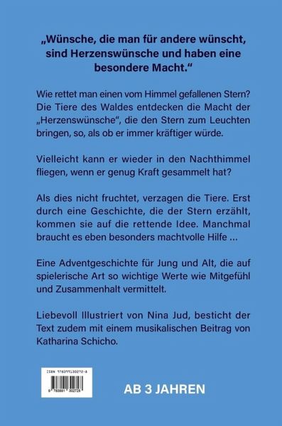 "Wünsche, die man für andere wünscht, sind Herzenswünsche und haben eine besondere Macht."Wie rettet man einen vom Himmel gefallenen Stern? Die Tiere des Waldes entdecken die Macht der "Herzenswünsche", die den Stern zum Leuchten bringen, so, als ob er immer kräftiger würde.Vielleicht kann er wieder in den Nachthimmel fliegen, wenn er genug Kraft gesammelt hat?Als dies nicht fruchtet, verzagen die Tiere. Erst durch eine Geschichte, die der Stern erzählt, kommen sie auf die rettende Idee. Manchmal braucht es eben besonders machtvolle Hilfe ... Eine Adventgeschichte für Jung und Alt, die auf spielerische Art so wichtige Werte wie Mitgefühl und Zusammenhalt vermittelt. Liebevoll Illustriert von Nina Jud, besticht der Text zudem mit einem musikalischen Beitrag von Katharina Schicho.