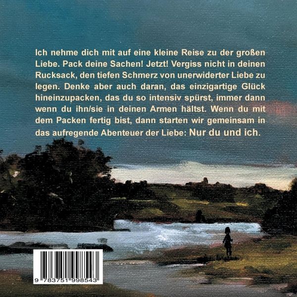 Ich nehme dich mit auf eine kleine Reise zu der großen Liebe. Pack deine Sachen! Jetzt! Vergiss nicht in deinen Rucksack, den tiefen Schmerz von unerwiderter Liebe zu legen. Denke aber auch daran, das einzigartige Glück hineinzupacken, das du so intensiv spürst, immer dann wenn du ihn/sie in deinen Armen hältst. Wenn du mit dem Packen fertig bist, dann starten wir gemeinsam in das aufregende Abenteuer der Liebe. Nur du und ich.