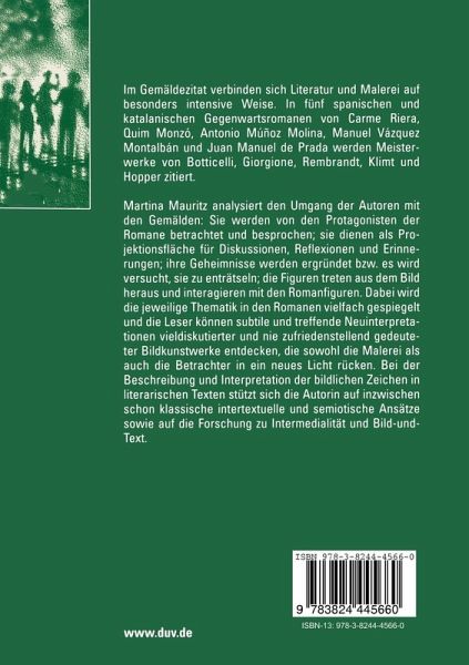 Im Gemäldezitat verbinden sich Literatur und Malerei auf besonders intensive Weise. In fünf spanischen und katalanischen Gegenwartsromanen von Carme Riera, Quim Monzó, Antonio Múñoz Molina, Manuel Vázquez Montalbán und Juan Manuel de Prada werden Meisterwerke von Botticelli, Giorgione, Rembrandt, Klimt und Hopper zitiert.