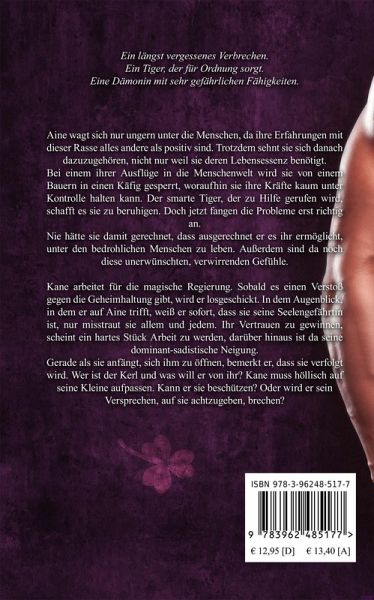 Ein längst vergessenes Verbrechen.Ein Tiger, der für Ordnung sorgt.Eine Dämonin mit sehr gefährlichen Fähigkeiten.Aine wagt sich nur ungern unter die Menschen, da ihre Erfahrungen mit dieser Rasse alles andere als positiv sind. Trotzdem sehnt sie sich danach dazuzugehören, nicht nur weil sie deren Lebensessenz benötigt.Bei einem ihrer Ausflüge in die Menschenwelt wird sie von einem Bauern in einen Käfig gesperrt, woraufhin sie ihre Kräfte kaum unter Kontrolle halten kann. Der smarte Tiger, der zu Hilfe gerufen wird, schafft es sie zu beruhigen. Doch jetzt fangen die Probleme erst richtig an.Nie hätte sie damit gerechnet, dass ausgerechnet er es ihr ermöglicht, unter den bedrohlichen Menschen zu leben. Außerdem sind da noch diese unerwünschten, verwirrenden Gefühle.Kane arbeitet für die magische Regierung. Sobald es einen Verstoß gegen die Geheimhaltung gibt, wird er losgeschickt. In dem Augenblick, in dem er auf Aine trifft, weiß er sofort, dass sie seine Seelengefährtin ist, nurmisstraut sie allem und jedem. Ihr Vertrauen zu gewinnen, scheint ein hartes Stück Arbeit zu werden, darüber hinaus ist da seine dominant-sadistische Neigung.Gerade als sie anfängt, sich ihm zu öffnen, bemerkt er, dass sie verfolgt wird. Wer ist der Kerl und was will er von ihr? Kane muss höllisch auf seine Kleine aufpassen. Kann er sie beschützen? Oder wird er sein Versprechen, auf sie achtzugeben, brechen?Eine Geschichte, die den Leser mit ins mystische Irland nimmt, in eine Welt, in der es echte Gefühle, sinnliche Leidenschaft und magische Geschöpfe gibt. Der Roman ist in sich abgeschlossen und enthält explizite Szenen