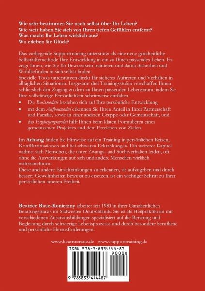 Wie sehr bestimmen Sie noch selbst ueber Ihr Leben? Wie weit haben Sie sich von Ihren tiefen inneren Gefuehlen entfernt? Das Supporttraining unterstuetzt Ihre persoenliche Entwicklung in ein zu Ihnen passendes Leben. Es zeigt Ihnen, wie Sie Ihr Bewusstsein trainieren und damit bei anstehenden Lebensveraenderungen Heilung, Sicherheit und Wohlbefinden in sich selbst finden. Als Selbsthilfetraining lernen Sie mit den Basismodulen selbstbestimmt Ihr Bewusstsein zu trainieren und Ihre individuelle Persoenlichkeit auszubilden. Mit dem Aufbaumodul erkennen Sie den Anteil, den Sie in Ihrer Familie, Gruppe oder Gemeinschaft annehmen koennen und mit einem Ergaenzungsmodul unterstuetzen Sie das Erreichen gemeinsamer Projekte. Insgesamt sechs persoenliche Tools helfen Ihnen, in Ihrem Alltag auch bei schwersten Belastungen bei sich selbst zu bleiben.