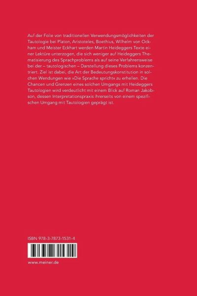 Einem Vergleich, der wie der vorliegende Martin Heideggers Seinsdenken und Roman Jakobsons strukturalistische Poetik engführt, fehlt das Tertium comparationis, das sich unmittelbar aus der Sachhaltigkeit von Heideggers und Jakobsons Schriften ergeben könnte. Er rückt daher ein Moment in den Mittelpunkt, das nur indirekt an den Texten der beiden Autoren zum Vorschein kommt: den Umgang mit Tautologien, wie er sich einerseits im eigenwilligen Sprachstil Heideggers und andererseits in Jakobsons Gedichtinterpretationen abzeichnet. Wenngleich sich dieser Umgang in den denkbar verschiedensten Ergebnissen, in Gestalt einer jeweiligen Theorie, äußert, so hat er doch für diese Ergebnisse und für ihren sprachlichen Vollzugsmodus einen vergleichbaren systematischen Stellenwert. Für die Verdeutlichung der Verfahrensweisen der beiden Autoren exponiert die Arbeit ein typologisches Spektrum an Mustern für ein Sprechen in und über Tautologien, d. h. die beiden wohl grundsätzlichen 'Verwendungsmöglichkeiten' der Tautologie: einerseits als ein sprachpraktisch relevanter Terminus technicus, wie er sich innerhalb der antiken Ars grammatica und Ars rhetorica herausbildet; andererseits als eine in ihrer philosophischen Sachhaltigkeit problematische Satzform. Auf der Folie von traditionellen Verwendungsmöglichkeiten der Tautologie bei Platon, Aristoteles, Boethius, Wilhem von Ockham und Meister Eckhard werden Heideggers Texte einer Lektüre unterzogen, die sich weniger auf Heideggers Thematisierung des Sprachproblems als auf seine Verfahrensweise bei der - tautologischen - Darstellung dieses Problems konzentriert. Ziel ist dabei, die Art der Bedeutungskonstitution in solchen Wendungen wie "Die Sprache spricht" zu erhellen. Die Chancen und Grenzen eines solchen Umgangs mit Heideggers Tautologien wird dann verdeutlicht mit einem Blick auf Jakobson, dessen Interpretationspraxis ihrerseits von einem spezifischen Umgang mit Tautologien geprägt ist.