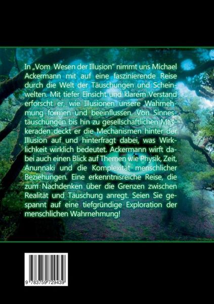 In "Vom Wesen der Illusion" nimmt uns Michael Ackermann mit auf eine faszinierende Reise durch die Welt der Täuschungen und Scheinwelten. Mit tiefer Einsicht und klarem Verstand erforscht er, wie Illusionen unsere Wahrnehmung formen und beeinflussen. Von Sinnestäuschungen bis hin zu gesellschaftlichen Maskeraden deckt er die Mechanismen hinter der Illusion auf und hinterfragt dabei, was Wirklichkeit wirklich bedeutet. Ackermann wirft dabei auch einen Blick auf Themen wie Physik, Zeit, Anunnaki und die Komplexität menschlicher Beziehungen. Eine erkenntnisreiche Reise, die zum Nachdenken über die Grenzen zwischen Realität und Täuschung anregt. Seien Sie gespannt auf eine tiefgründige Exploration der menschlichen Wahrnehmung!