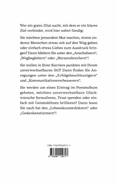 Wer ein gutes Zitat sucht, mit dem er ein klares Ziel verbindet, wird hier sofort fündig:Sie möchten jemandem Mut machen, einem anderen Menschen etwas mit auf den Weg geben oder einfach etwas Liebes zum Ausdruck bringen? Dann blättern Sie unter den "Anschubsern", "Wegbegleitern" oder "Herzensbrechern"!Sie wollen in Ihrer Karriere punkten mit Ihrem unverwechselbaren Stil? Dann finden Sie Anregungen unter den "Erfolgsbeschleunigern" und "Kommunikationsverbesserern". Sie werden um einen Eintrag im Poesiealbum gebeten, möchten unverwechselbare Glückwünsche formulieren, Trost spenden oder einfach mit Geistesblitzen brillieren? Dann lesen Sie nach bei den "Lebenskunsterklärern" oder "Gedankenstürmern"!