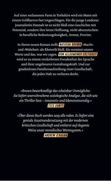 Auf einer verlassenen Farm in Yorkshire wird ein Mann mit einem Goldbarren fast totgeschlagen. Für die junge Londoner Journalistin Hannah ist es nicht bloß eine Geschichte mit Potenzial, sondern ihre letzte Hoffnung, nicht abzurutschen: in berufliche Bedeutungslosigkeit, Armut, Provinz. Sie recherchiert - mit letzter Kraft - und bringt einen moralisch bankrotten Investmentbanker, eine antiwoke-Kolumnistin und eine radikale anarchistische Bewegung mit dem Goldbarren in Verbindung. Was sie dann schreibt, geht viral, big-time, und bringt Hannah zurück ins Gespräch, mit Freundinnen, Redakteuren, einer Netflix-Produktionsfirma. Doch ihre spektakuläre Reportage und der sich einstellende Erfolg werfen schnell eine grundsätzlichere Frage auf: Was ist von allgemeiner Gültigkeit in diesem zerbrochenen Land?