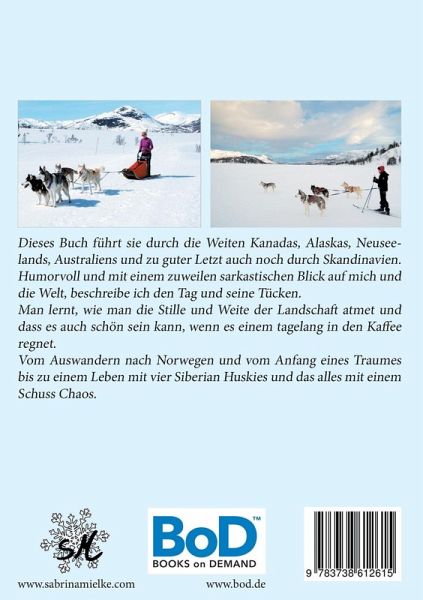 Dieses Buch führt sie durch die Weiten Kanadas, Alaskas, Neuseelands, Australiens und zu guter Letzt auch noch durch Skandinavien. Humorvoll und mit einem zuweilen sarkastischen Blick auf mich und die Welt, beschreibe ich den Tag und seine Tücken. Man lernt, wie man die Stille und Weite der Landschaft atmet und dass es auch schön sein kann, wenn es einem tagelang in den Kaffee regnet.Vom Auswandern nach Norwegen und vom Anfang eines Traumes bis zu einem Leben mit vier Siberian Huskies und das alles mit einem Schuss Chaos.