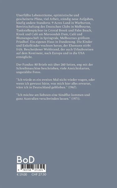 Unerfüllte Lebensträume, optimistische und gescheiterte Pläne, viel Arbeit, ständig neue Aufgaben, häufig andere Standorte. 9 Acres Land in Warburton, Bewirtschaftung des Deutschen Clubs in Melbourne, Tankstellenpächter in Crystal Brook und Palm Beach, Kiosk und Café am Maroondah Dam, Café und Blumengeschäft in Springvale, Melbournes größtem Friedhof. Ein eigenes Haus in Dandenong. Die Kinder und Enkelkinder wachsen heran, der Ehemann stirbt früh. Bescheidener Wohlstand, der auch Urlaubsreisen auf dem Kontinent, nach Europa und in die USA ermöglicht. Der Fundus: 80 Briefe mit über 260 Seiten, eng mit der Schreibmaschine beschrieben, viele Ansichtskarten, ungezählte Fotos."Ich würde es ein zweites Mal nicht wieder wagen, oder wenn ich gewusst hätte, was mich hier alles erwartet, wäre ich in Deutschland geblieben." (1967)."Ich möchte am liebsten eine Sündflut kommen und ganz Australien verschwinden lassen." (1971).