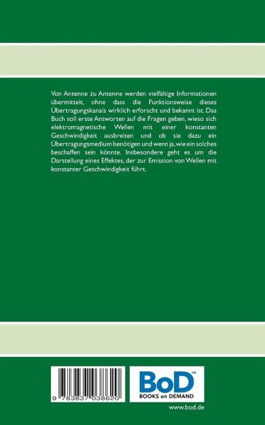 Von Antenne zu Antenne werden vielfältige Informationen übermittelt, ohne dass die Funktionsweise dieses Übertragungskanals wirklich erforscht und bekannt ist. Das Buch soll erste Antworten auf die Fragen geben, wieso sich elektromagnetische Wellen mit einer konstanten Geschwindigkeit ausbreiten und ob sie dazu ein Übertragungsmedium benötigen und wenn ja, wie ein solches beschaffen sein könnte. Insbesondere geht es um die Darstellung eines Effektes, der zur Emission von Wellen mit konstanter Geschwindigkeit führt.