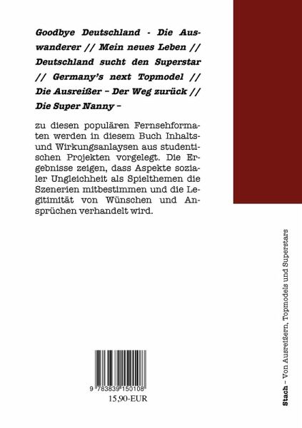 Goodbye Deutschland - Die Auswanderer// Mein neues Leben //Deutschland sucht den Superstar// Germany's next Topmodel //Die Ausreißer - Der Weg zurück //Die Super Nanny -zu diesen populären Fernsehformatenwerden in diesem Buch Inhalts- undWirkungsanlaysen aus studentischenProjekten vorgelegt. Die Ergebnissezeigen, dass Aspekte sozialerUngleichheit als Spielthemen dieSzenerien mitbestimmen und die Legitimitätvon Wünschen und Ansprüchenverhandelt wird.