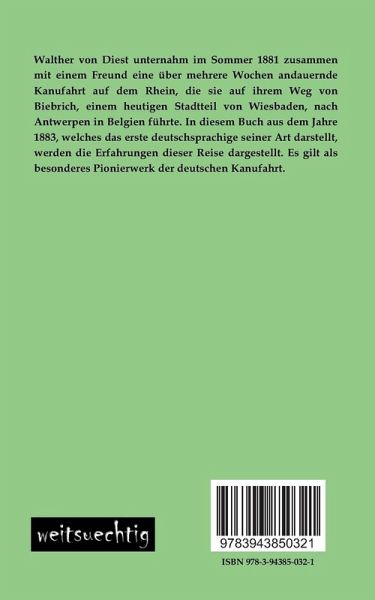 Walther von Diest unternahm im Sommer 1881 zusammen mit einem Freund eine über mehrere Wochen andauernde Kanufahrt auf dem Rhein, die sie auf ihrem Weg von Biebrich, einem heutigen Stadtteil von Wiesbaden, nach Antwerpen in Belgien führte. In diesem Buch aus dem Jahre 1883, welches das erste deutschsprachige seiner Art darstellt, werden die Erfahrungen dieser Reise dargestellt. Es gilt als besonderes Pionierwerk der deutschen Kanufahrt.