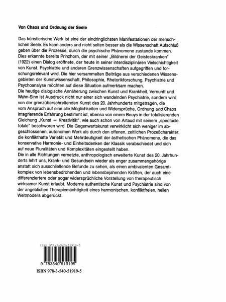 Das künstlerische Werk ist eine der greifbarsten Manifestationen der menschlichen Seele und mag auch Aufschluß geben über die Prozesse, durch die psychische Phänomene zustande kommen. Daher braucht die Psychiatrie die (moderne) Kunst, um psychisches Geschehen differenzierter erkennen zu können. Der Dialog zwischen Kunst und Psychiatrie dauert schon länger an, wobei der entscheidende Impuls sicher von Prinzhorn (1922) mit seiner "Bildnerei der Geisteskranken" kam. Das vorliegende Buch ist bewußt interdisziplinär aufgebaut, um das Verhältnis von Kunst und Psychiatrie aus möglichst verschiedenen Blickwinkeln zu beleuchten.