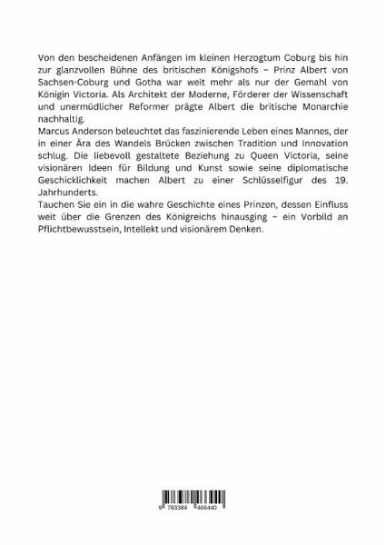Von den bescheidenen Anfängen im kleinen Herzogtum Coburg bis hin zur glanzvollen Bühne des britischen Königshofs - Prinz Albert von Sachsen-Coburg und Gotha war weit mehr als nur der Gemahl von Königin Victoria. Als Architekt der Moderne, Förderer der Wissenschaft und unermüdlicher Reformer prägte Albert die britische Monarchie nach-haltig.Marcus Anderson beleuchtet das faszinierende Leben eines Mannes, der in einer Ära des Wandels Brücken zwischen Tradition und Innovation schlug. Die liebevoll gestaltete Beziehung zu Queen Victoria, seine visionären Ideen für Bildung und Kunst sowie seine diplomatische Geschicklichkeit machen Albert zu einer Schlüsselfigur des 19. Jahrhunderts.Tauchen Sie ein in die wahre Geschichte eines Prinzen, dessen Einfluss weit über die Grenzen des Königreichs hinausging - ein Vorbild an Pflichtbewusstsein, Intellekt und visionärem Denken.