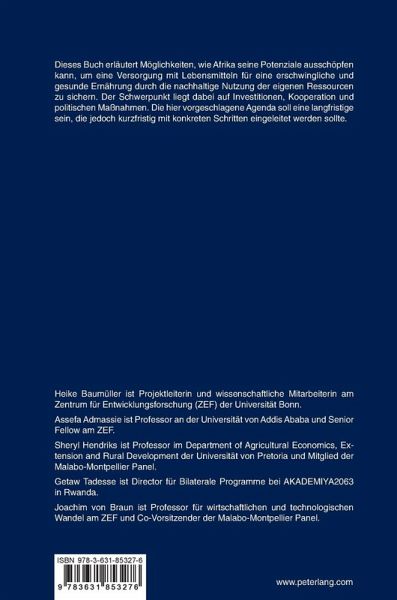 Dieses Buch erläutert Möglichkeiten, wie Afrika seine Potenziale ausschöpfen kann, um eine Versorgung mit Lebensmitteln für eine erschwingliche und gesunde Ernährung durch die nachhaltige Nutzung der eigenen Ressourcen zu sichern. Der Schwerpunkt liegt dabei auf Investitionen, Kooperation und politischen Maßnahmen. Die hier vorgeschlagene Agenda soll eine langfristige sein, die jedoch kurzfristig mit konkreten Schritten eingeleitet werden sollte.