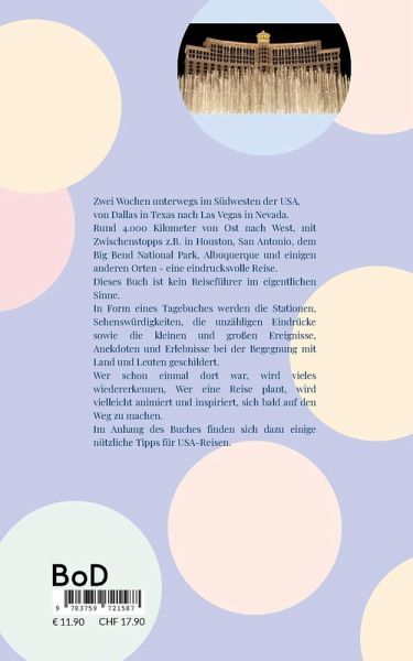 Zwei Wochen unterwegs im Südwesten der USA, von Dallas in Texas nach Las Vegas in Nevada.Rund 4.000 Kilometer von Ost nach West, mit Zwischenstopps z.B. in Houston, San Antonio, dem Big Bend National Park, Albuquerque und einigen anderen Orten - eine eindrucksvolle Reise.Dieses Buch ist kein Reiseführer im eigentlichen Sinne. In Form eines Tagebuches werden die Stationen, Sehenswürdigkeiten, die unzähligen Eindrücke sowie die kleinen und großen Ereignisse, Anekdoten und Erlebnisse bei der Begegnung mit Land und Leuten geschildert.Wer schon einmal dort war, wird vieles wiedererkennen, Wer eine Reise plant, wird vielleicht animiert und inspiriert, sich bald auf den Weg zu machen.Im Anhang des Buches finden sich dazu einige nützliche Tipps für USA-Reisen.