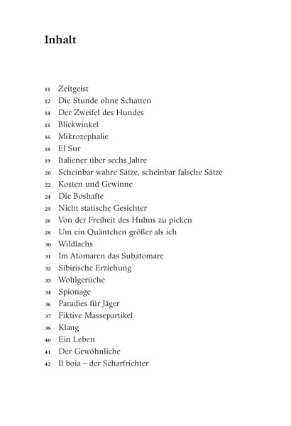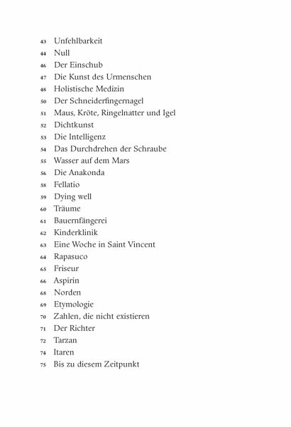 Gaetano Altopianos Themen konnen vielfaltiger nicht sein: Von physikalischen Gesetzen, soziologischen Studien, medizinischen Untersuchungen, Heil- und Therapiemitteln, Glaubenssatzen, Zahlenmystik, okonomischen Theorien, über Nostalgie, Synasthesie, Prophetie bis Alltagsbeobachtungen reicht das Repertoire, von Descartes, Schopenhauer, Hegel, Freud, Platon, Dante ... die Anspielungen.