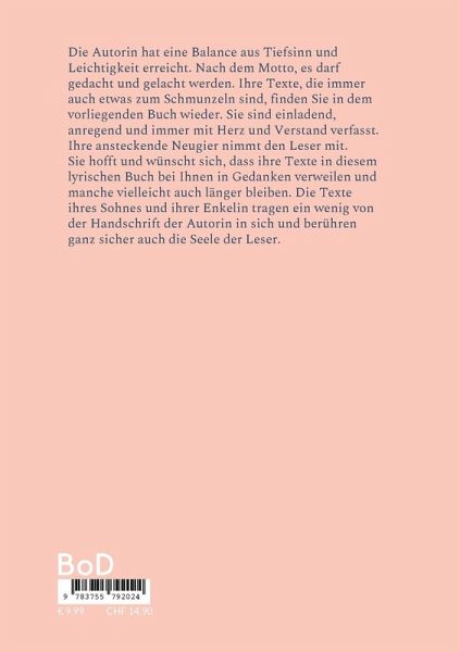 Die Autorin hat eine Balance aus Tiefsinn und Leichtigkeit erreicht. Nach dem Motto, es darf gedacht und gelacht werden. Ihre Texte, die immer auch etwas zum Schmunzeln sind, finden Sie in dem vorliegenden Buch wieder. Sie sind einladend, anregend und immer mit Herz und Verstand verfasst.Ihre ansteckende Neugier nimmt den Leser mit. Sie hofft und wünscht sich, dass ihre Texte in diesem lyrischen Buch bei Ihnen in Gedanken verweilen und manche vielleicht auch länger bleiben. Die Texte ihres Sohnes und ihrer Enkelin tragen ein wenig von der Handschrift der Autorin in sich und berühren ganz sicher auch die Seele der Leser.