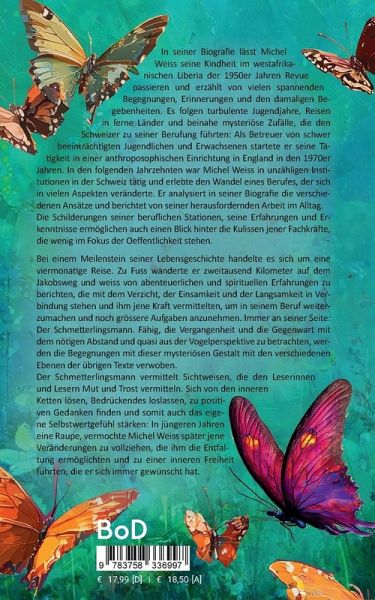 Bei einem Meilenstein seiner Lebensgeschichte handelte es sich um eine viermonatige Reise. Zu Fuss wanderte er zweitausend Kilometer auf dem Jakobsweg und weiss von abenteuerlichen und spirituellen Erfahrungen zu berichten, die mit dem Verzicht, der Einsamkeit und der Langsamkeit in Verbindung stehen und ihm jene Kraft vermittelten, um in seinem Beruf weiterzumachen und noch grössere Aufgaben anzunehmen. Immer an seiner Seite: Der Schmetterlingsmann. Fähig, die Vergangenheit und die Gegenwart mit dem nötigen Abstand und quasi aus der Vogelperspektive zu betrachten, werden die Begegnungen mit dieser mysteriösen Gestalt mit den verschiedenen Ebenen der übrigen Texte verwoben. Der Schmetterlingsmann vermittelt Sichtweisen, die den Leserinnen und Lesern Mut und Trost vermitteln. Sich von den inneren Ketten lösen, Bedrückendes loslassen, zu positiven Gedanken finden und somit auch das eigene Selbstwertgefühl stärken: In jüngeren Jahren eine Raupe, vermochte Michel Weiss später jene Veränderungen zu vollziehen, die ihm die Entfaltung ermöglichten und zu einer inneren Freiheit führten, die er sich immer gewünscht hat.