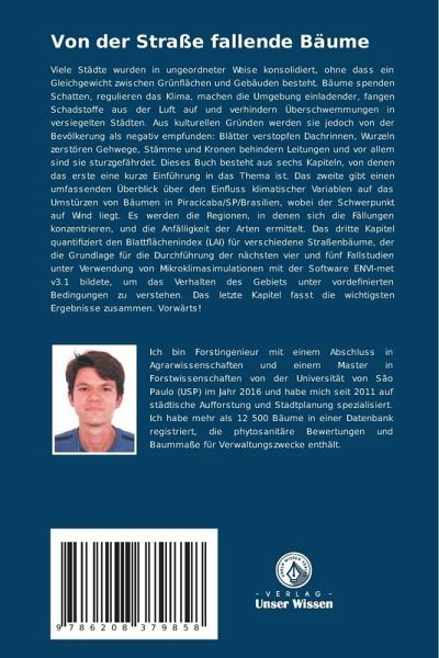Viele Städte wurden in ungeordneter Weise konsolidiert, ohne dass ein Gleichgewicht zwischen Grünflächen und Gebäuden besteht. Bäume spenden Schatten, regulieren das Klima, machen die Umgebung einladender, fangen Schadstoffe aus der Luft auf und verhindern Überschwemmungen in versiegelten Städten. Aus kulturellen Gründen werden sie jedoch von der Bevölkerung als negativ empfunden: Blätter verstopfen Dachrinnen, Wurzeln zerstören Gehwege, Stämme und Kronen behindern Leitungen und vor allem sind sie sturzgefährdet. Dieses Buch besteht aus sechs Kapiteln, von denen das erste eine kurze Einführung in das Thema ist. Das zweite gibt einen umfassenden Überblick über den Einfluss klimatischer Variablen auf das Umstürzen von Bäumen in Piracicaba/SP/Brasilien, wobei der Schwerpunkt auf Wind liegt. Es werden die Regionen, in denen sich die Fällungen konzentrieren, und die Anfälligkeit der Arten ermittelt. Das dritte Kapitel quantifiziert den Blattflächenindex (LAI) für verschiedene Straßenbäume, der die Grundlage für die Durchführung der nächsten vier und fünf Fallstudien unter Verwendung von Mikroklimasimulationen mit der Software ENVI-met v3.1 bildete, um das Verhalten des Gebiets unter vordefinierten Bedingungen zu verstehen. Das letzte Kapitel fasst die wichtigsten Ergebnisse zusammen. Vorwärts!
