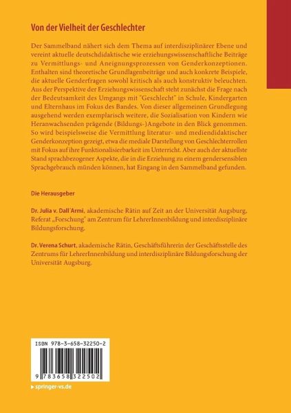 Der Sammelband nähert sich dem Thema auf interdisziplinärer Ebene und vereint aktuelle deutschdidaktische wie erziehungswissenschaftliche Beiträge zu Vermittlungs- und Aneignungsprozessen von Genderkonzeptionen. Enthalten sind theoretische Grundlagenbeiträge und auch konkrete Beispiele, die aktuelle Genderfragen sowohl kritisch als auch konstruktiv beleuchten. Aus der Perspektive der Erziehungswissenschaft steht zunächst die Frage nach der Bedeutsamkeit des Umgangs mit "Geschlecht" in Schule, Kindergarten und Elternhaus im Fokus des Bandes. Von dieser allgemeinen Grundlegung ausgehend werden exemplarisch weitere, die Sozialisation von Kindern wie Heranwachsenden prägende (Bildungs-)Angebote in den Blick genommen. So wird beispielsweise die Vermittlung literatur- und mediendidaktischer Genderkonzeption gezeigt, etwa die mediale Darstellung von Geschlechterrollen mit Fokus auf ihre Funktionalisierbarkeit im Unterricht. Aber auch der aktuellste Stand sprachbezogener Aspekte, die in die Erziehung zu einem gendersensiblen Sprachgebrauch münden können, hat Eingang in den Sammelband gefunden.