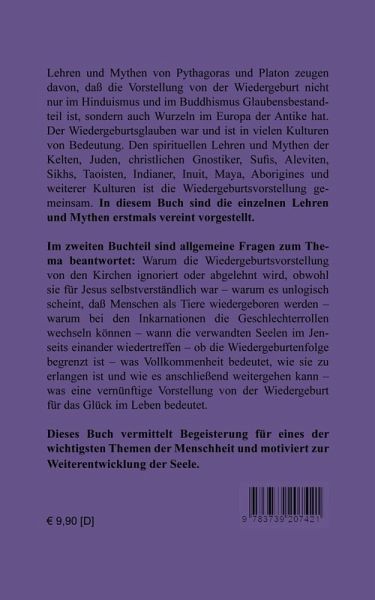 In diesem Buch sind die kaum bekannten Lehren und Mythen von der Wiedergeburt weltweit erstmals vereint vorgestellt: von Platon, den Gnostikern, Kelten, Indianern, u.v.w. - die wichtigsten Erklärungen allgemein: Glück im Leben, Resonanzprinzip, Wechsel der Geschlechterrollen, Wiedertreffen im Jenseits, u.v.m.Die logischen Beweise Sokrates´ nach Platon:Das Übergehen von Wachheit in Schlaf ist einschlafen, von Leben in Tod sterben. Das umgekehrte Übergehen von Schlaf in Wachheit ist aufwachen, folglich von Tod in Leben aufleben.