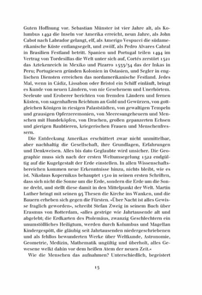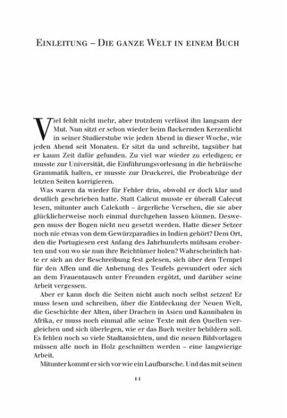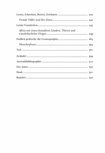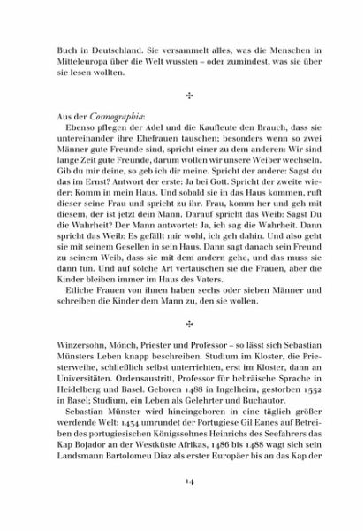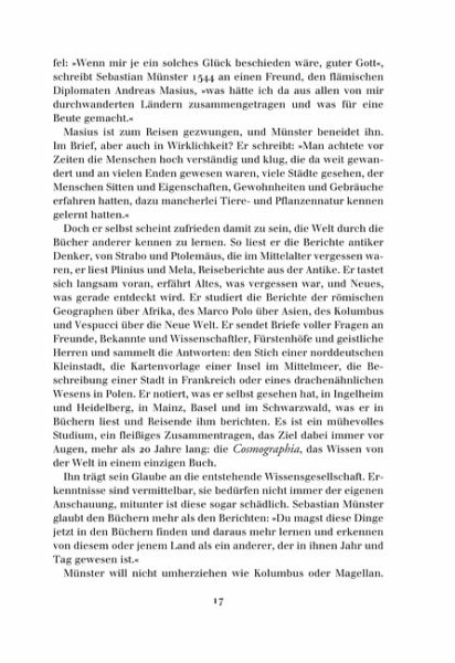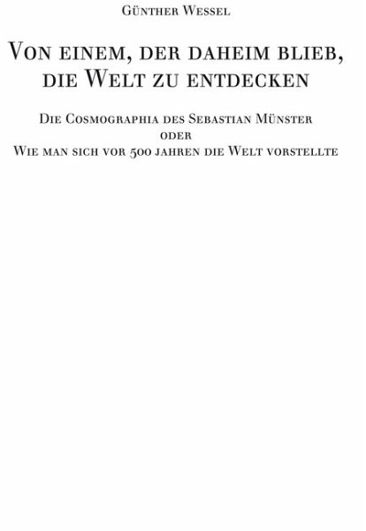 Kolumbus entdeckt Amerika, Cortés erobert Mexiko, Magellan umsegelt die Welt. In dieser turbulenten Zeit beginnt Sebastian Münster - geboren 1488 in Ingelheim, gestorben 1552 in Basel - ein ehrgeiziges Projekt: Er will alles Wissen über die Welt in einem einzigen Buch zusammentragen. Über zwanzig Jahre lang arbeitet er an diesem kolossalen Unterfangen. Dabei verlässt er sein Studierzimmer nur selten, unermüdlich liest er die Reiseliteratur der Entdecker und der antiken Schriftsteller.Günther Wessel gelingt die Verknüpfung von Münsters Biografie mit geschichtlichen und kulturellen Ereignissen wie zum Beispiel der Reformation. Darüber hinaus geht er mit eingeschobenen Kapiteln, die jeweils den Lebensstationen Münsters zugeordnet sind, auf verschiedene Aspekte der Cosmographia ein. Die zahlreichen Holzschnitte (Karten, Monster, Kannibalen, Stadtansichten, Porträts usw.), verdeutlichen dabei, was die Cosmographia bietet und wie sie dies tut.-Die 1. Auflage erschien 2004 im Campus Verlag, Frankfurt.