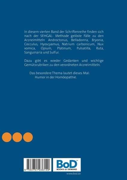 In diesem vierten Band der Schriftenreihe finden sich nach der SEHGAL- Methode gelöste Fälle zu den Arzneimitteln Androctonus, Belladonna, Bryonia, Cocculus, Hyoscyamus, Natrium carbonicum, Nux vomica, Opium, Platinum, Pulsatilla, Ruta, Sanguinaria und Sulfur. Dazu gibt es wieder Gedanken und wichtige Gemütsrubriken zu den verordneten Arzneimitteln.Das besondere Thema lautet dieses Mal: Humor in der Homöopathie.