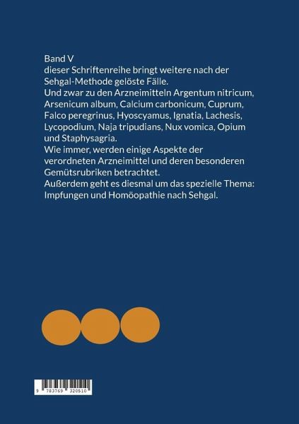 Band V dieser Schriftenreihe bringt weitere nach der Sehgal-Methode gelöste Fälle. Und zwar zu den Arzneimitteln Argentum nitricum, Arsenicum album, Calcium carbonicum, Cuprum, Falco peregrinus, Hyoscyamus, Ignatia, Lachesis, Lycopodium, Naja tripudians, Nux vomica, Opium und Staphysagria. Wie immer werden einige Aspekte der verordneten Arzneimittel und deren besonderen Gemütsrubriken betrachtet. Außerdem geht es diesmal um das spezielle Thema: Impfungen und Homöopathie nach Sehgal.