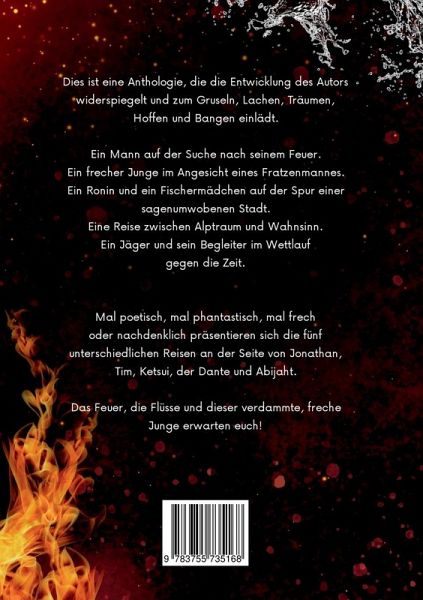 Dies ist eine Anthologie, die die Entwicklung des Autors widerspiegelt und zum Gruseln, Lachen, Träumen, Hoffen und Bangen einlädt.Ein Mann auf der Suche nach seinem Feuer.Ein frecher Junge im Angesicht eines Fratzenmannes.Ein Ronin und ein Fischermädchen auf der Spur einer sagenumwobenen Stadt.Eine Reise zwischen Alptraum und Wahnsinn.Ein Jäger und sein Begleiter im Wettlauf gegen die Zeit.Mal poetisch, mal phantastisch, mal frech oder nachdenklich präsentieren sich die fünf unterschiedlichen Reisen an der Seite von Jonathan, Tim, Ketsui, der Dante und Abijaht.Das Feuer, die Flüsse und dieser verdammte, freche Junge erwarten euch!